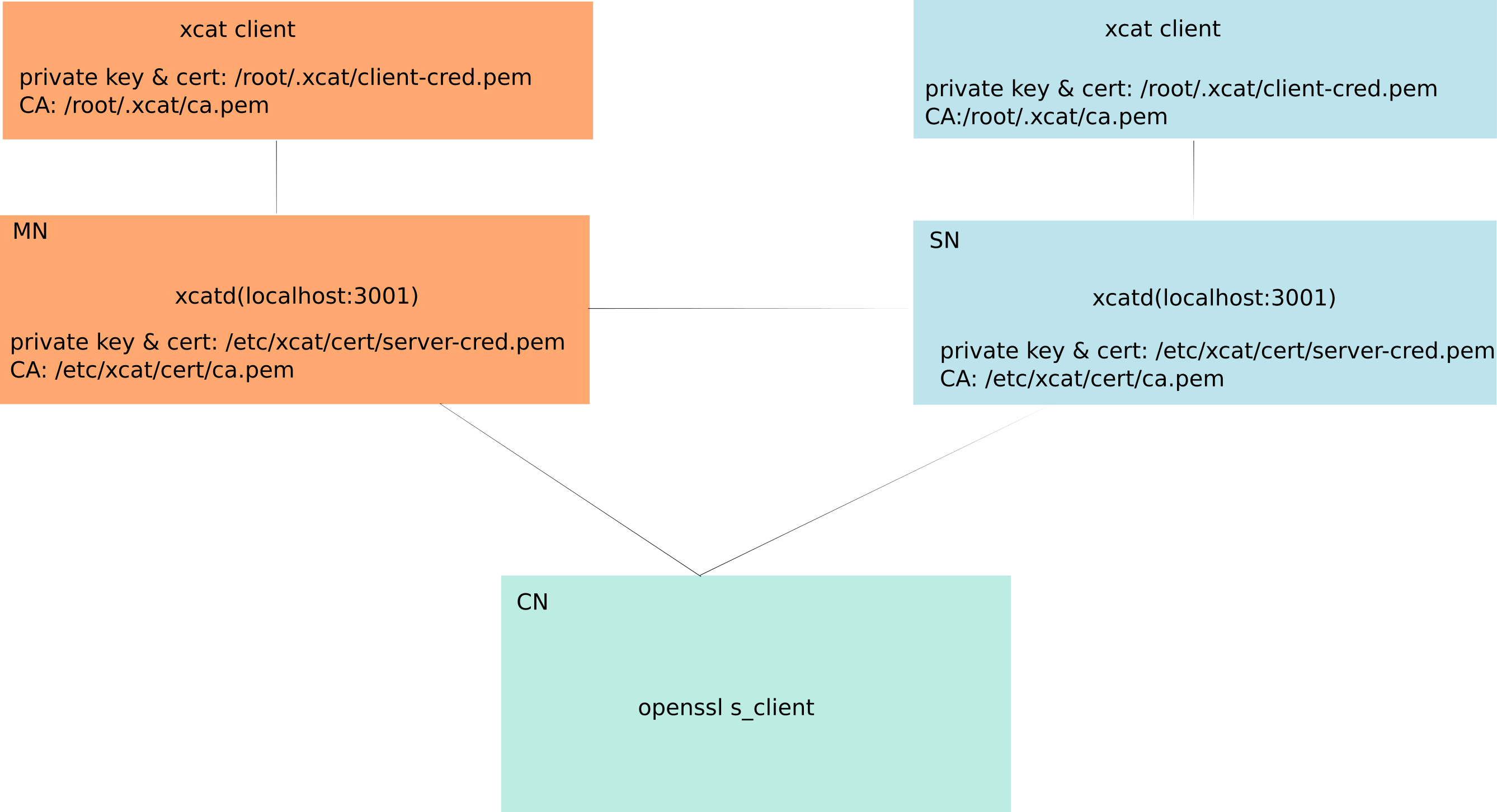 command)===> /install/postscripts/_xcat/ca.pem (MN) ===(node provision/updatenode)==> /xcatpost/_xcat/ca.pem (SN and CN) ==(run “servicenode” postscript)==> /root/.xcat/ca.pem (SN)xCAT server credential(server-cred.pem):